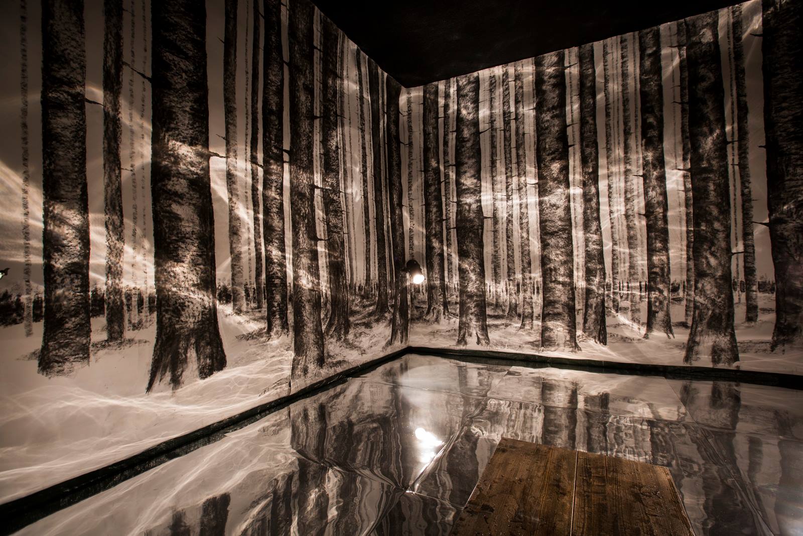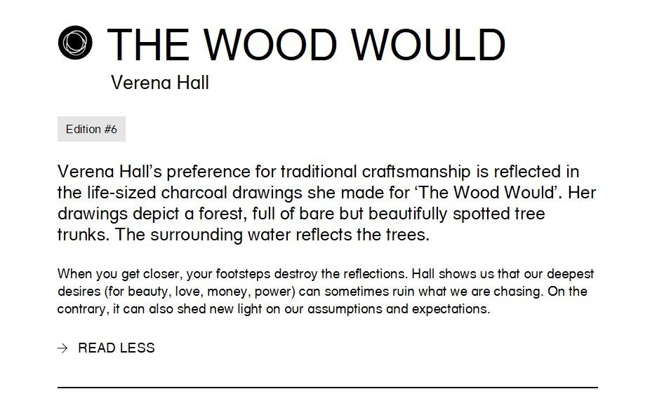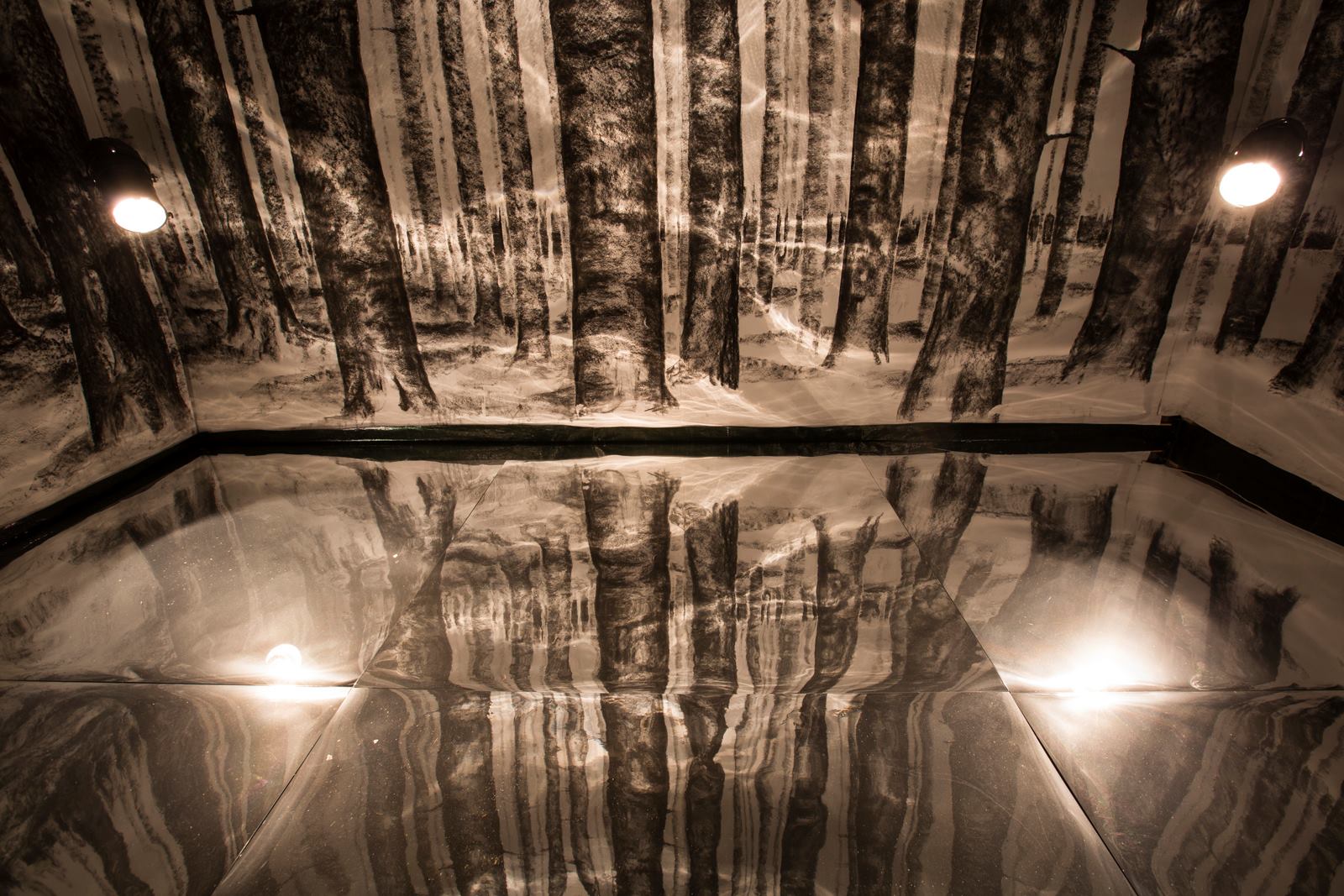 Lifesize, charcoal drawings depict a forest, full of bare but beautifully spotted tree trunks. The surrounding water reflects the trees.When you get closer, your footsteps destroy the reflections. Showing us that our deepest desires (for beauty, love, money, power) can sometimes ruin what we are chasing. On the contrary, it can also shed new light on our assumptions and expectations.