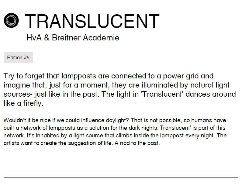 Try to forget that lampposts are connected to a power grid and imagine that, just for a moment, they are illuminated by natural light sources- just like in the past. The light in 'Translucent' dances around like a firefly.